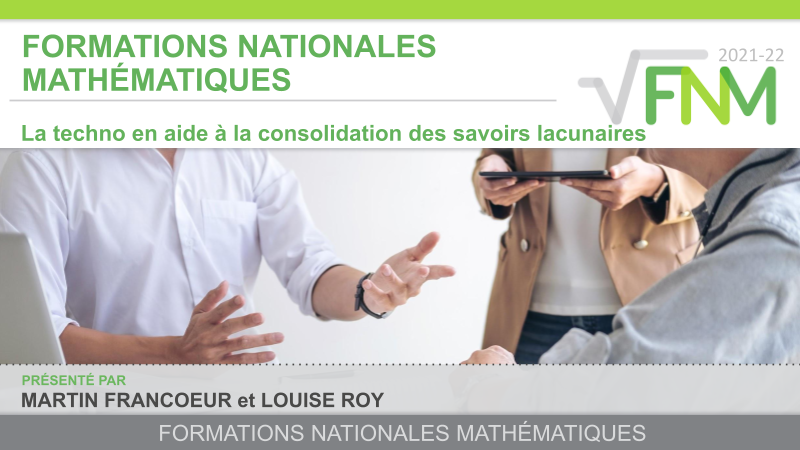 FORMATIONS NATIONALES MATHÉMATIQUES 1 FORMATIONS NATIONALES MATHÉMATIQUES MARTIN FRANCOEUR et LOUISE ROY PRÉSENTÉ PAR La techno en aide à la consolidation des savoirs lacunaires 2021-22